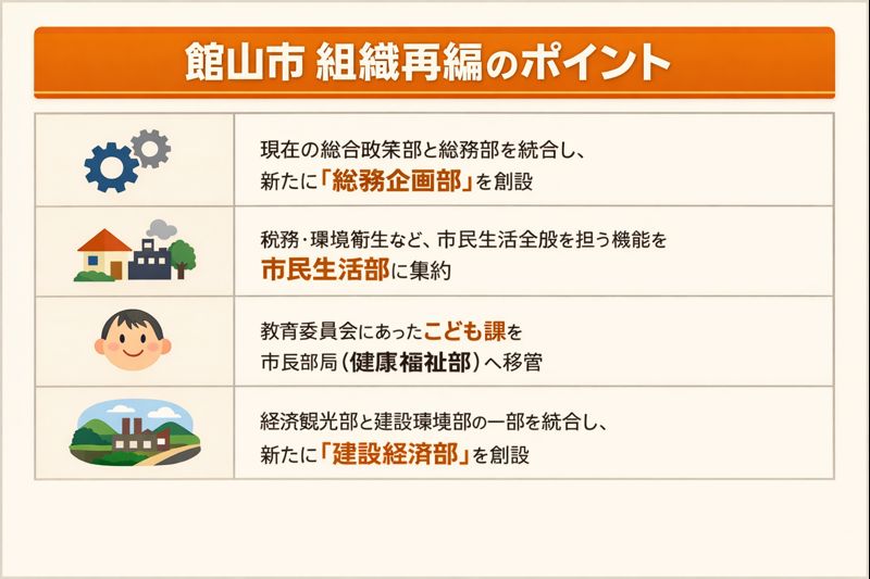 12月議会において、館山市の組織再編に関する条例改正が議決されました。委員会報告では、年間2,000万〜2,500万円程度の財政削減効果が示されましたが、それだけでは今回の組織再編の本質は伝わりません。 この再編は、単な… 続きを読む 館山市の組織再編について ― 議決内容とその背景