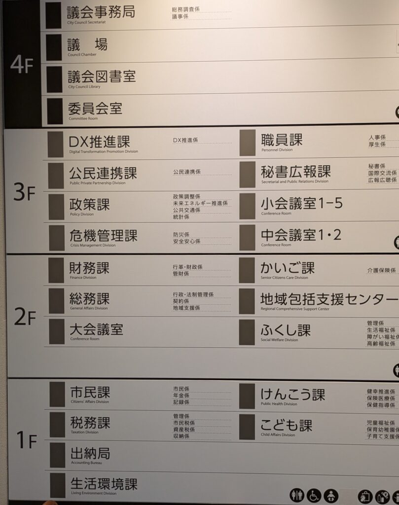庁内案内表示。けんこうやかいご、ふくし、こどもが平仮名で表記されているのは親しみをもってもらうため。館山市とほぼ規模は変わらないのにDX推進課や公民連携課があるなど、また改めてお聞きしたいことがたくさんあります。